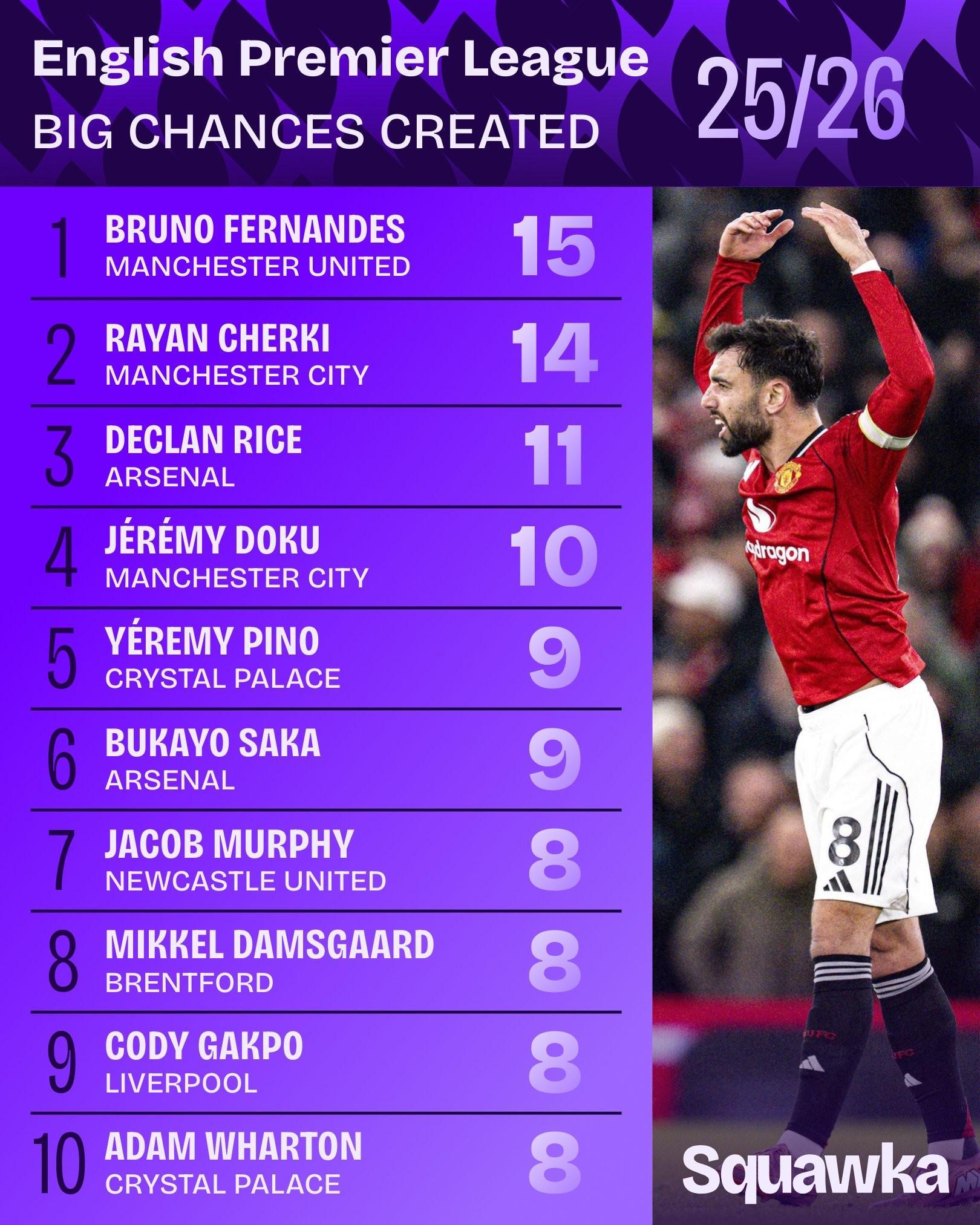 据统计,布鲁诺-费尔南德斯在前23轮创造15次绝佳机会,位居榜首,曼城中场谢尔基紧随其后。